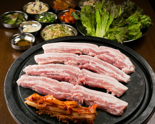 Tonchang introduced samgyeopsal dining to Tokyo and remains a reference point for Korean BBQ. Staff assist with grilling and slicing meat directly at the table. The pork belly is served thick-cut, followed by bokkeumbap cooked on the grill.