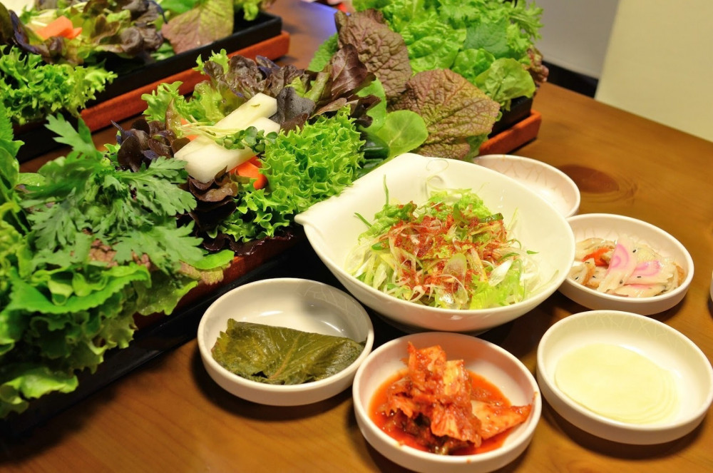 Kurumu is known for its structured presentation and variety of fresh vegetables served with grilled meats. The setup focuses on layered wraps with a wide selection of greens and condiments.