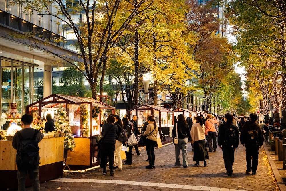Running alongside the Marunouchi Illuminations, this “street park” turns Naka-dori and Gyoko-dori into a long corridor of food, drinks and small gift stalls. Nakadori focuses on winter menus from nearby hotels and cafés, while Gyoko-dori adds fir trees, chalet-style stands, pizza, stews and hot chocolate.