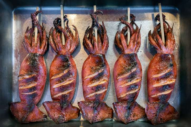 - Ika-yaki – Grilled whole squid on a stick, brushed with a sweet-savory soy-based glaze.