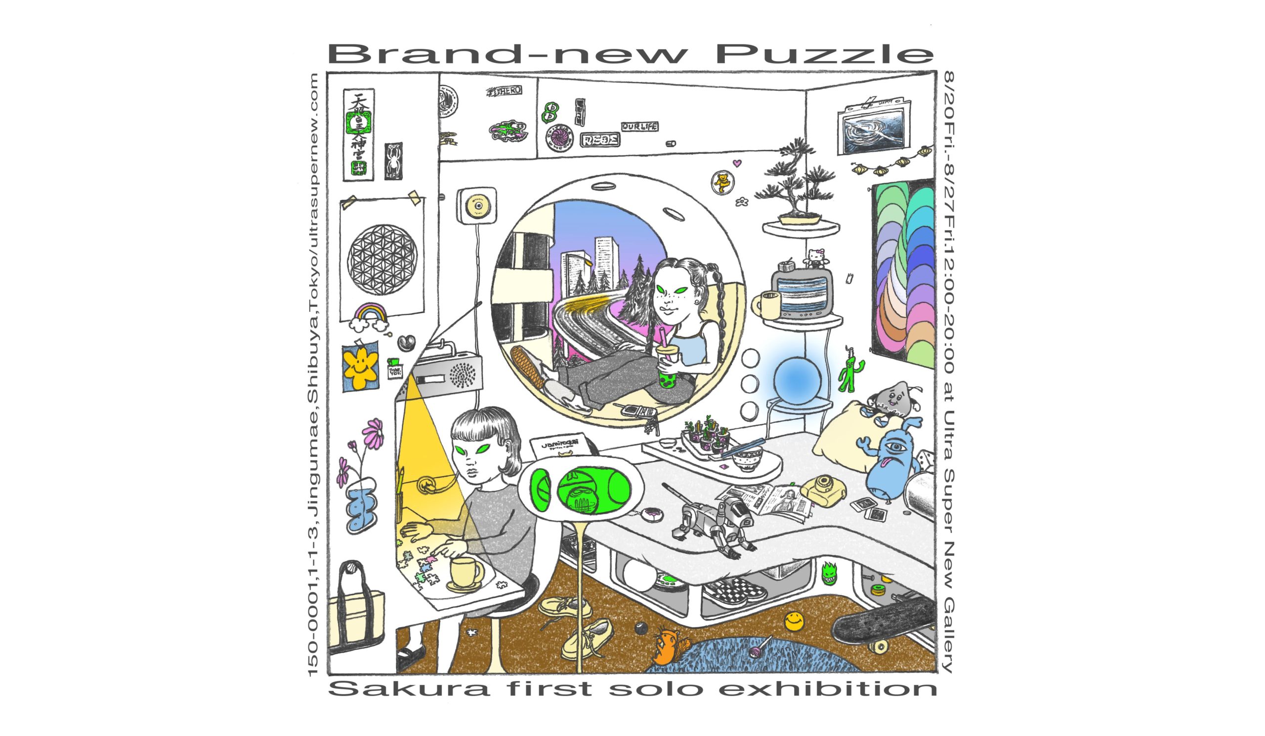 Held in UltraSuperNew Gallery in Harajuku, “Brand-new Puzzle” is Tokyo-based illustrator and graphic artist Sakura’s first solo exhibition. Her works feature quirky caricatures and nostalgic imagery. Influenced by California culture and everyday life in Japan, this exhibition showcases how Sakura lives her life like a puzzle, piecing together new ways of life day by day.