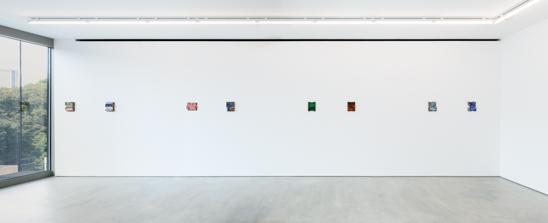 TOPICA PICTUS takes its name, firstly, from topos, a rhetorical device that Aristotle deployed to describe a source or place from which a speaker may locate their argument. Secondly, the name is taken from the Latin word pictus, which means “painted.” Okazaki uses his small-scale, abstract paintings as the containing factor, a topos, to loosely suggest his influences and present them alongside one another. In TOPICA PICTUS Revisited: Forty Red, White, And Blue Shoestrings And A Thousand Telephones, the artist unites under a topos his encounter with becoming defamiliarized from his physicality—recorded and presented here through the act of painting—with references in the works’ titles to concepts such as Bob Dylan’s “Highway 61 Revisited,” Polish folklore, or 黙示 , the Japanese word for “revelation.”