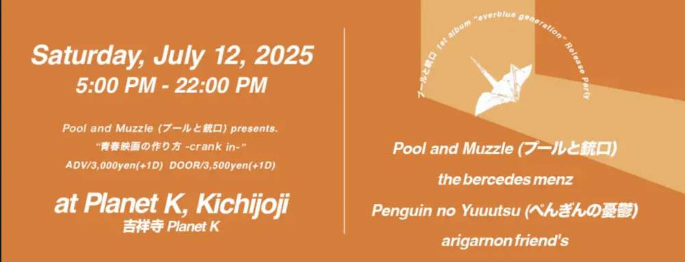 A live event organized by the Tokyo-based Japanese indie band “Pool and Muzzle”. They will be joined by arigarnon friend’s, Penguin no Yuutsu(ぺんぎんの憂鬱), and the bercedes menz.