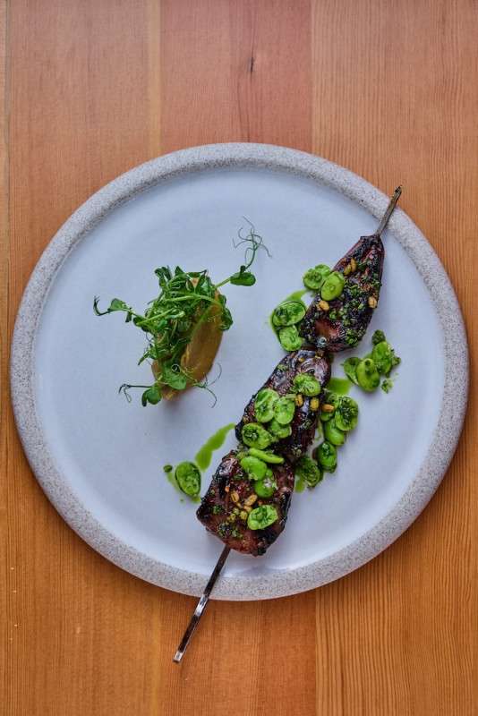 Grilled Lamb Heart, Fresh Sansho Pepper Sauce, Cresson Purée, Urui Leaves