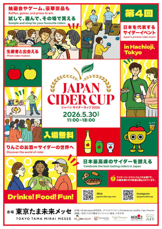 inCiderJapan is delighted to announce the date for the fourth annual Japan Cider Cup international cider event: Saturday, 30 May 2026. Taking place once again at the Tokyo Tama Mirai Messe in Hachioji, Tokyo, the Japan Cider Cup is the country’s premier celebration of cider, the alcoholic apple beverage that continues to gain popularity in Japan since its breakout in 2019.