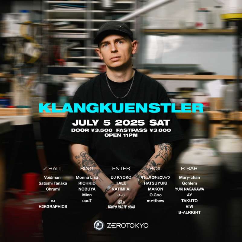 Berlin’s techno producer Klangkuenstler touches down in Japan for an unforgettable night of underground sound. Fresh off global festivals and the helm of his own event series OUTWORLD, Klangkuenstler brings his high-impact energy to a massive multi-floor party featuring some of the best names on the scene. Expect immersive visuals, pounding bass and a crowd that lives for the night.