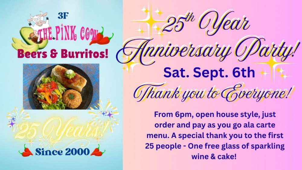 Pink Cow in Tokyo is celebrating their 25th anniversary party by inviting everyone to come out to see the New Cow in Akasaka. No cover charge, just a simple open house style, à la carte, order and pay as you go menu. As a welcome and thank you for the first 25 people are getting a free glass of sparkling wine and cake.