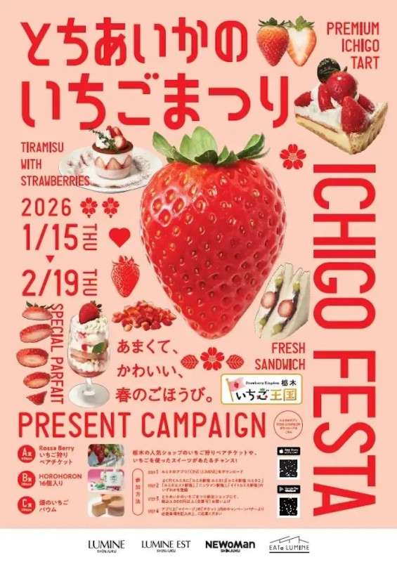 Strawberry lovers, here’s a reason to visit Shinjuku this season! The Tochiaika Strawberry Festival brings together 44 stores offering 56 strawberry-themed dishes, from sweets and drinks to salads and bread, all made with luxurious strawberries from Tochigi Prefecture. Visitors can stroll through the shops, try limited-time menus, and fully immerse themselves in the strawberry experience. Plus, anyone who spends over ¥3,000 at participating shops can enter a campaign via the ONE LUMINE app for a chance to win a strawberry picking experience in Tochigi and strawberry-based treats—making it a sweet day out in Shinjuku for both foodies and families alike.
