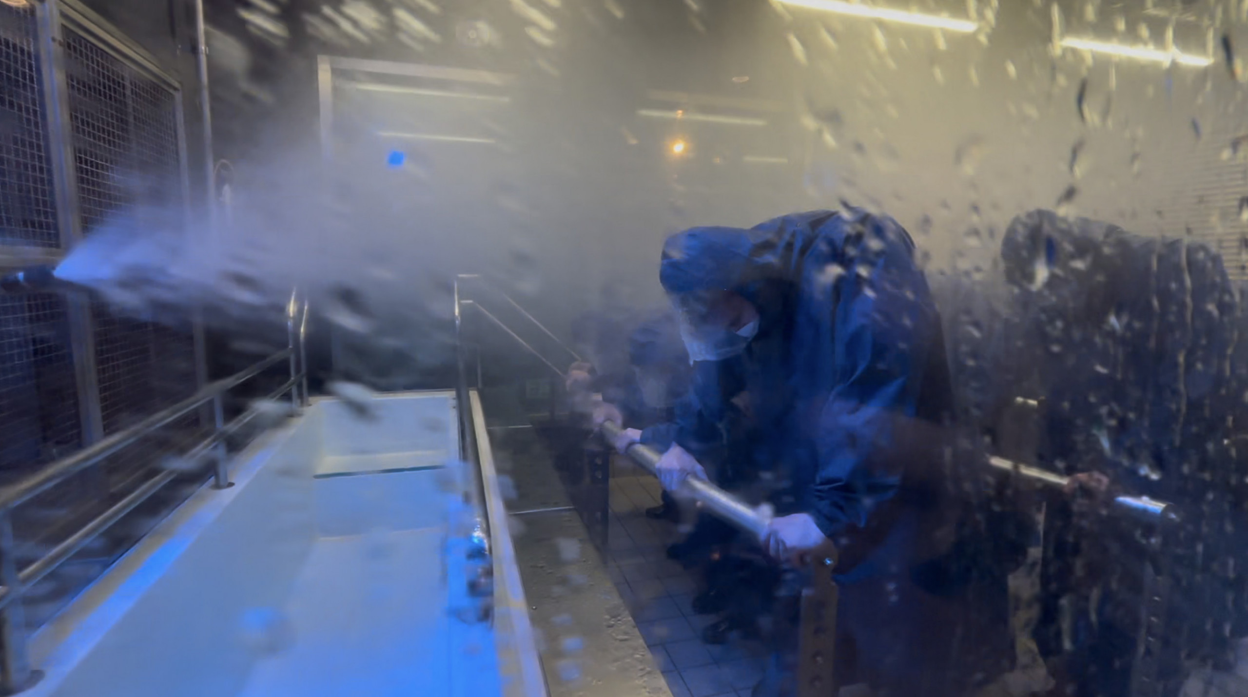 Typhoon season in Japan isn’t something to take lightly. In the Storm Experience, you’re outfitted with heavy-duty rain gear: thick plastic coats, massive rubber boots—basically everything to keep you dry from head to toe. Then, the fun starts. Imagine being hit with high-pressure water and strong winds. It’s chaotic, hilarious and informative all at once. You’ll stumble, laugh and genuinely learn how to brace yourself against the elements.