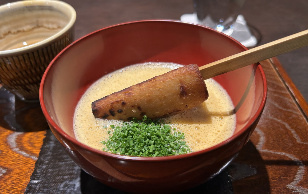 Dip a charcoal-grilled skewer of ebi taro into a bowl of warm lobster bisque, the cream clinging briefly before slipping back. At Den Kushi Flori, Japanese sensibility and French technique meet, not on a white plate but on a stick. The counter-only restaurant brings together Zaiyu Hasegawa of Den and Hiroyasu Kawate of Florilège. The usual ceremony of fine dining softens, leaving precision and quiet playfulness. Each dish is finished in front of you, a brush of sauce here, a final garnish just before it’s passed across the counter. Behind a row of donabe pots, a chef stirs with his back turned as smoke rises from the center grill. The scent of charcoal and sweet sauce hangs in the air as a skewered kamo meatball arrives glazed with negi, juicy and smoky. The meal ends with a gentle dilemma: seasonal ice cream mochi with azuki, or flan topped with softly whipped cream. Either one makes for a soft landing before you walk back up the stairs.
