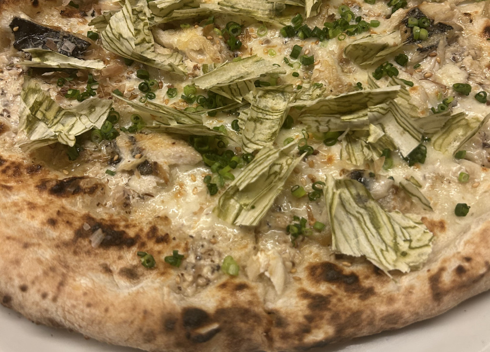 The back wall is stacked with neatly split firewood. Marble counters gleam under bright light, and the white-tiled kitchen feels immaculate. Waves of heat from the wood-fired oven warm your cheeks. At Marumo, a pizza arrives topped with pale green ribbons of kombu and finely-sliced negi. Beneath it, dried shiitake cream, mackerel, bonito flakes and mozzarella melt into a crust that’s soft and airy. From the counter the chef checks each pie, offering a quiet word to a younger cook before the next goes in. One pie feels like enough until another emerges from the oven, blistered and fragrant. Nearby tables lean forward in anticipation. You step back into the night air still carrying the warmth with you.