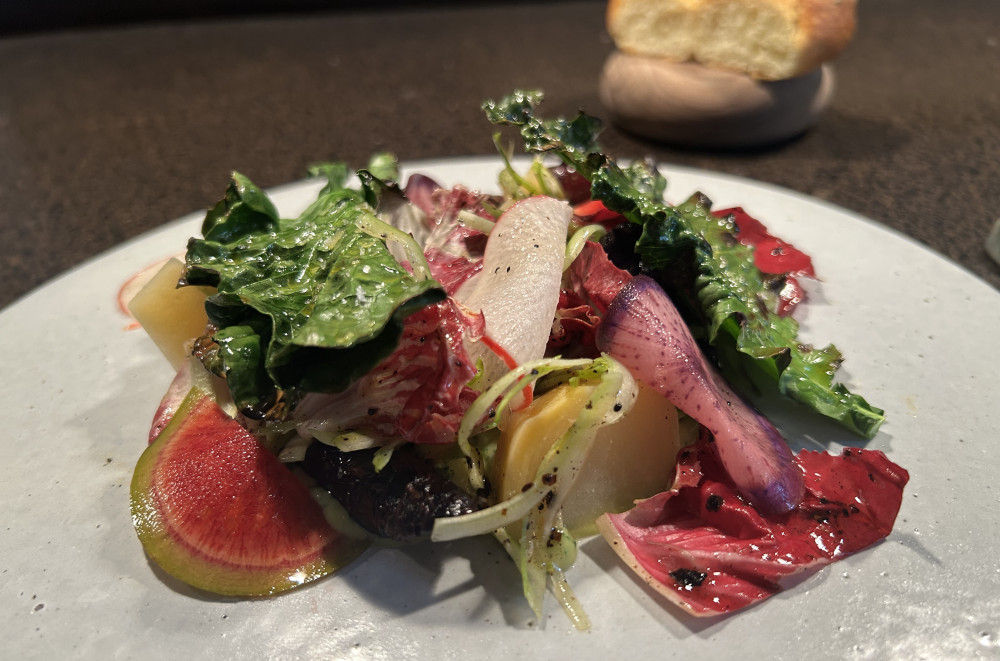 Koji-marinated pen shells rest on fermented parsnip, gently lifted by orange vermouth. Trout roe, bright yellow and translucent, releases a soft pop with each bite. Nearby, cauliflower crackles on the stove. A splash of wine sends a brief flame up the pan, like stirring embers back to life. Chef Harashima moves with quiet control. In a navy pin-striped apron, glasses pushed up on his forehead, he nappés radicchio with béarnaise, shaving truffle at the counter’s edge. By the fourth course, you notice you’ve slowed without meaning to. The final pan turns once more over blue flame. Steam rises from the apple Madeira sauce, its sweetness restrained, meeting the umami of roasted kamo finished in duck dashi. Outside, Shimokitazawa moves at its usual unhurried pace. You forget the language of fusion and simply stay a little longer.