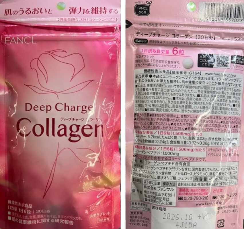 FANCL, a leading beauty and wellness brand in Japan, is well-known for its popular Deep Charge Collagen line. These collagen tablets feature highly absorbable collagen peptides, and their mild fruity flavor makes them easy to take. The formula is enriched with hyaluronic acid, rose bud extract, isoquercitrin, and vitamin C—ingredients that support skin hydration, elasticity, and overall radiance.