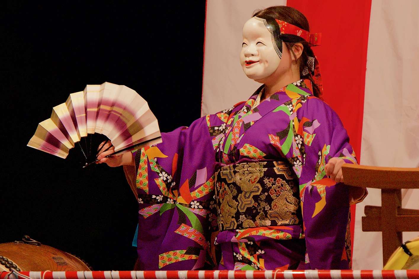 Noh is a 600-year-old classical theater form characterized by slow, controlled movements and poetic chanting. Performers often wear carved wooden masks to portray spirits, gods or historical figures. The minimalist stage design emphasizes subtle gesture and atmosphere.