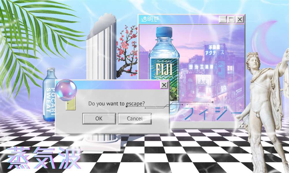 Vaporwave also uses water imagery for its surreal and relaxing feel: tropical pools, mall fountains, light reflecting on smooth surfaces. Interestingly, since the genre often repurposes Japanese ads and packaging, Pocari Sweat has also appeared in vaporware.