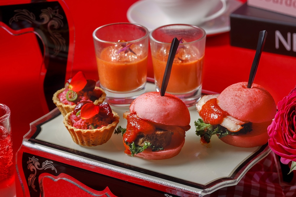 On the savory side, you’ll find a trio of color-coordinated delights: red paprika mousse with tomato and rose crystal jelly, a beet tabbouleh tart, and ZelkovA’s signature pink duck burger with a spicy raspberry sauce—a playful nod to diner culture with a gourmet twist.