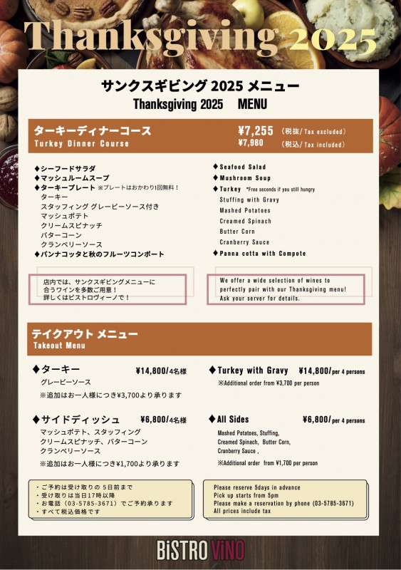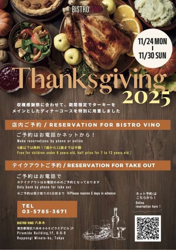 As the cool autumn breeze sweeps through the city, the season of Thanksgiving in Tokyo draws near once again. Roppongi’s sophisticated Bistro Vino is set to host its highly anticipated Thanksgiving feast from November 24 to November 30, 2025. For a comforting blend of tradition and modern culinary flair, book a table with loved ones for this year’s celebration.