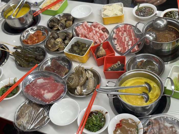 Down south, the Guangdong-style hot pot takes a lighter, ocean-inspired approach. Think fresh shrimp, plump clams and all kinds of seafood in in a clear, aromatic broth. Springy meatballs—especially the famous Chaoshan beef balls—are also a local favorite. The selection of vegetables is more diverse as well, including southern specialties like bamboo fungus and termite mushrooms, giving the meal a distinctly southern character.