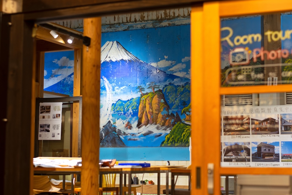 Stepping inside, it feels just like a sento at first glance. The rows of shoe cabinets, the numbered wooden placard keys—every familiar detail intact. Beyond the sliding glass door marked onna (women’s entrance), the baths sit empty beneath a timeworn mural of snow-capped Mt. Fuji. Once a fading relic, the bathhouse now breathes new life as rébon Kaisaiyu, where whiffs of home-roasted coffee fill the space once thick with steam. In the former changing rooms, guests linger beneath airy ceilings, sipping coffee and savoring homemade ice cream.