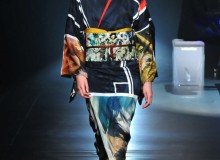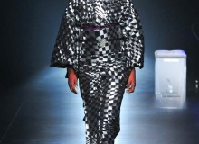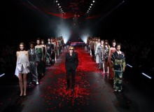 Yoshiki’s show catered to a vision of youth and included a wide variation of glam dresses and edgier-style kimono. There’s no underestimating the power of this artist; the collection felt like an impeccably detailed wardrobe of a Japanese rocker chick: the super-short, sparkly, asymmetrically shoulderless dresses with an idiosyncratic punky 80s silhouette. In the second half, the master himself joined the models on the catwalk, playing his signature clear Kawai piano, which was lit from below with a row of blue lights, and the audience was transformed into his rockstar mythology.