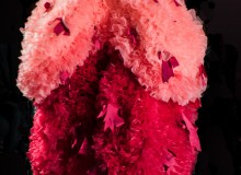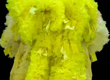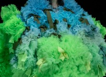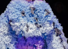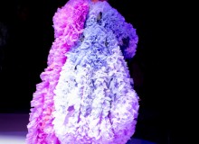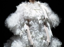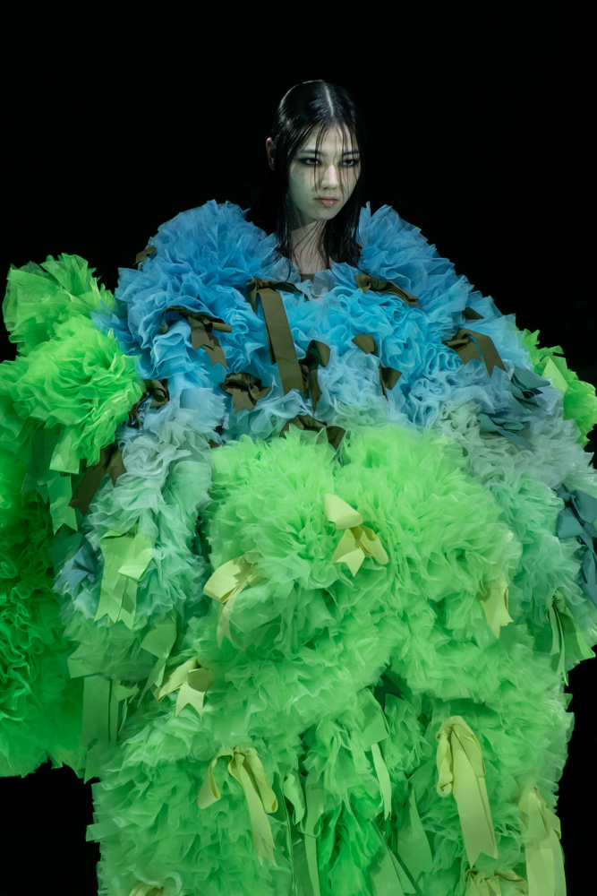 Geometrically constructed with extravagant silhouettes, Koizumi’s statement pieces brought drama to the largely one-toned event. The dresses weren’t, by any means, everyday garments; everything was hand-stitched and made from as much as two meters of fabric, which Koizumi custom makes for individual clients in his apartment studio in Nakameguro. It’s not the first time we’ve seen voluminous mille-feuille, over-the-top dresses, but Koizumi’s designs are made of Japanese polyester organza. The result is striking, with mountains of tulle capes. His flamboyant vision gave an additional dose of drama to his already extravagant silhouettes.