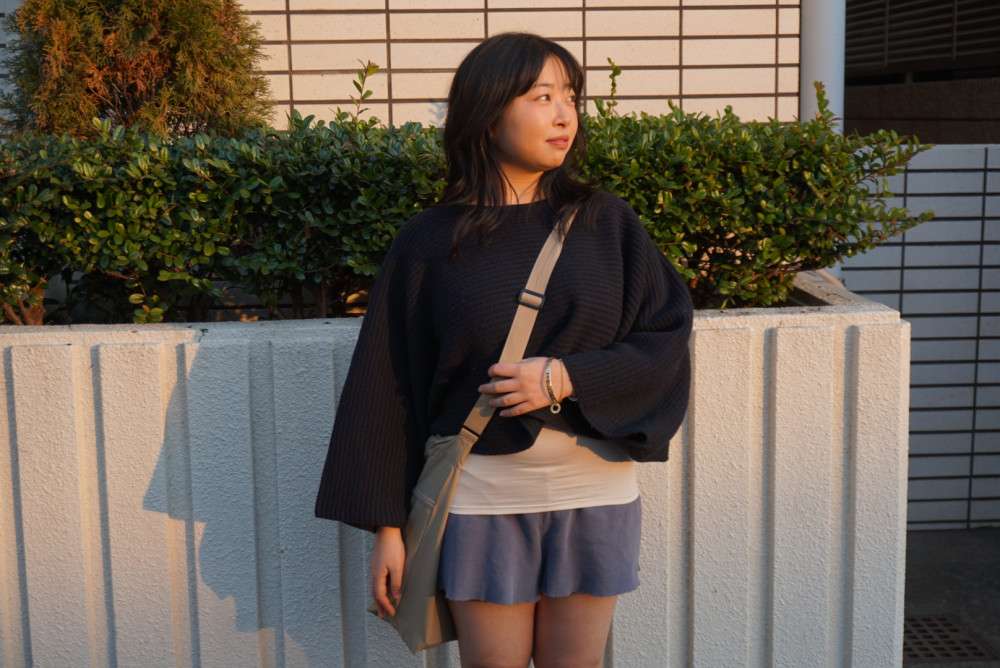 The Look: A relaxed, oversized knit sweater featuring wide, dramatic sleeves is paired with lightweight shorts for a balanced silhouette that feels effortless yet intentional.