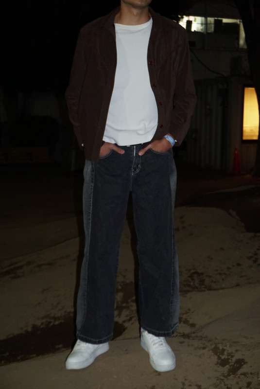 The Look: A chocolate-toned, slim-fit button-down layered over a clean white base, paired with wide-leg black jeans that capture the balanced urban aesthetic.