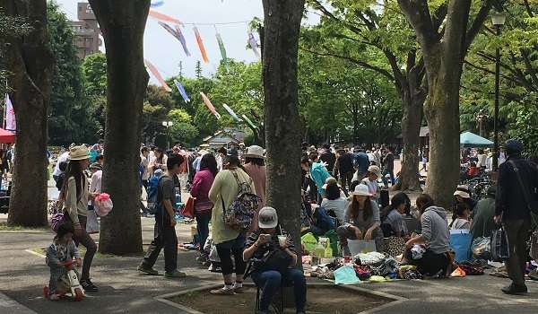 Popular with people in their 20s to 40s, the Setagaya Park flea market features around 100 to 150 vendors selling everything from vintage kimonos and yukatas to Japanese ceramics to second-hand goods. Between browsing stalls, families can take kids to the park’s mini steam train or nearby playgrounds, making it an easy weekend outing for both thrifters and families.