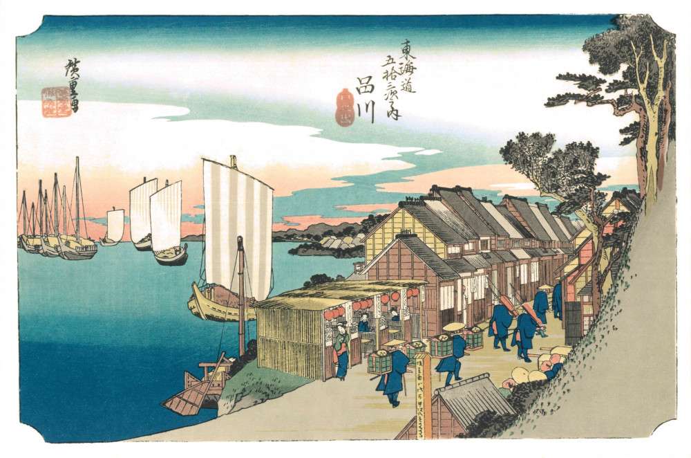 Further south, Shinagawa was Edo’s maritime entry point, a major post town and harbor on the Tokaido Road. It bustled with inns and warehouses, ferrying not only people but also marine goods such as nori (seaweed), dried fish, and salt. This made Shinagawa a key hub where both water and land transport converged.