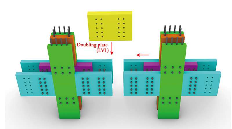 To achieve the same dimensions as a concrete building, the building uses a new method for unifying columns and beams. This includes using rigid joints without steel connection components and newly designed wood joint panels, increasing strength via insertion.